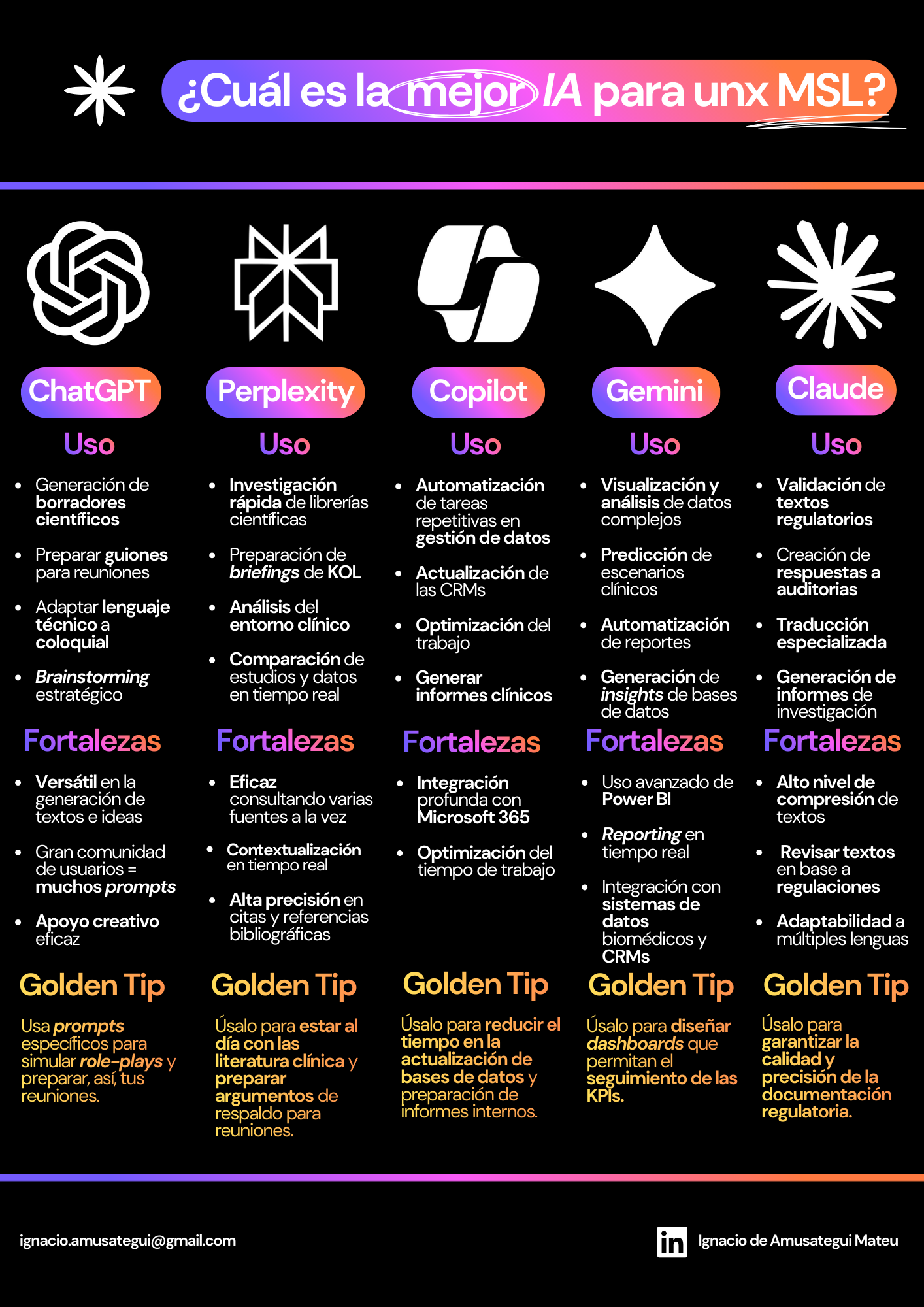Cuando del trabajo de un MSL se trata, hay que tener en cuenta 3 pilares importantes para decidir que IA vamos a usar con cada tarea: